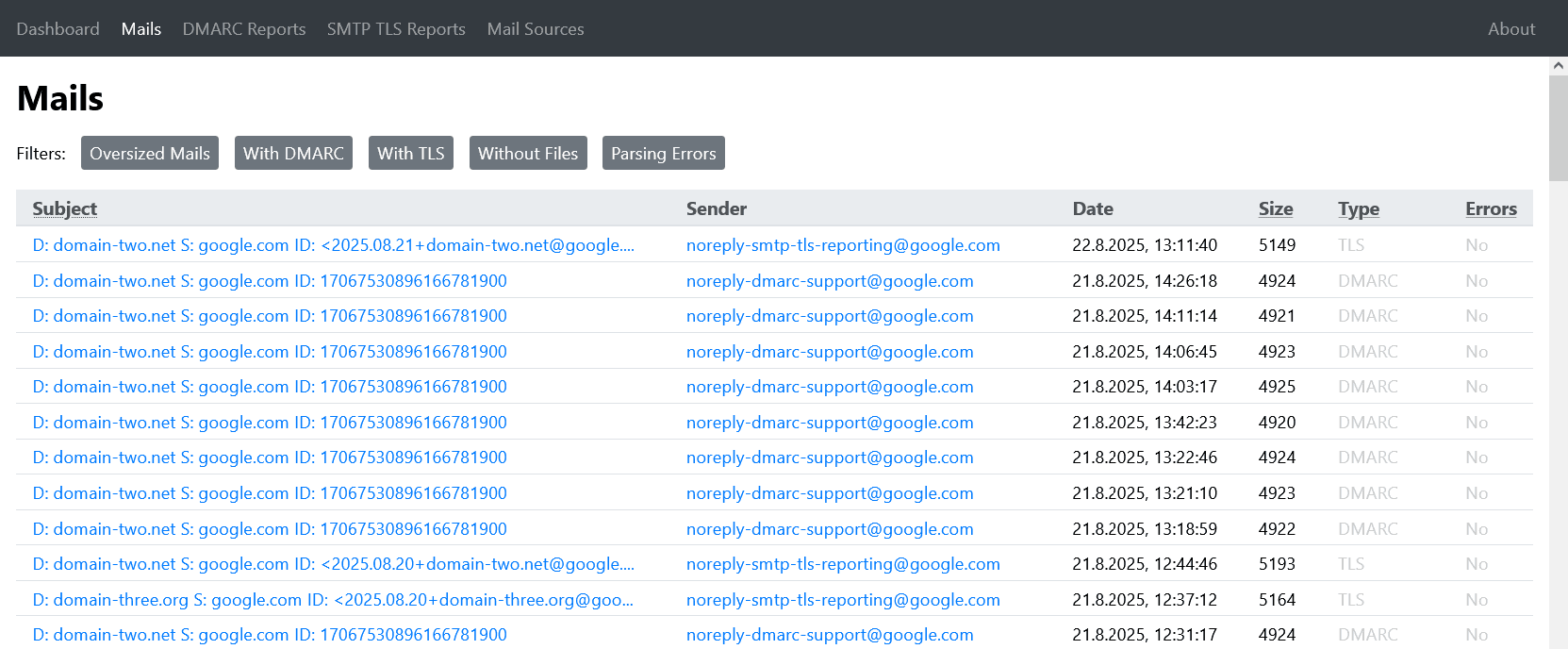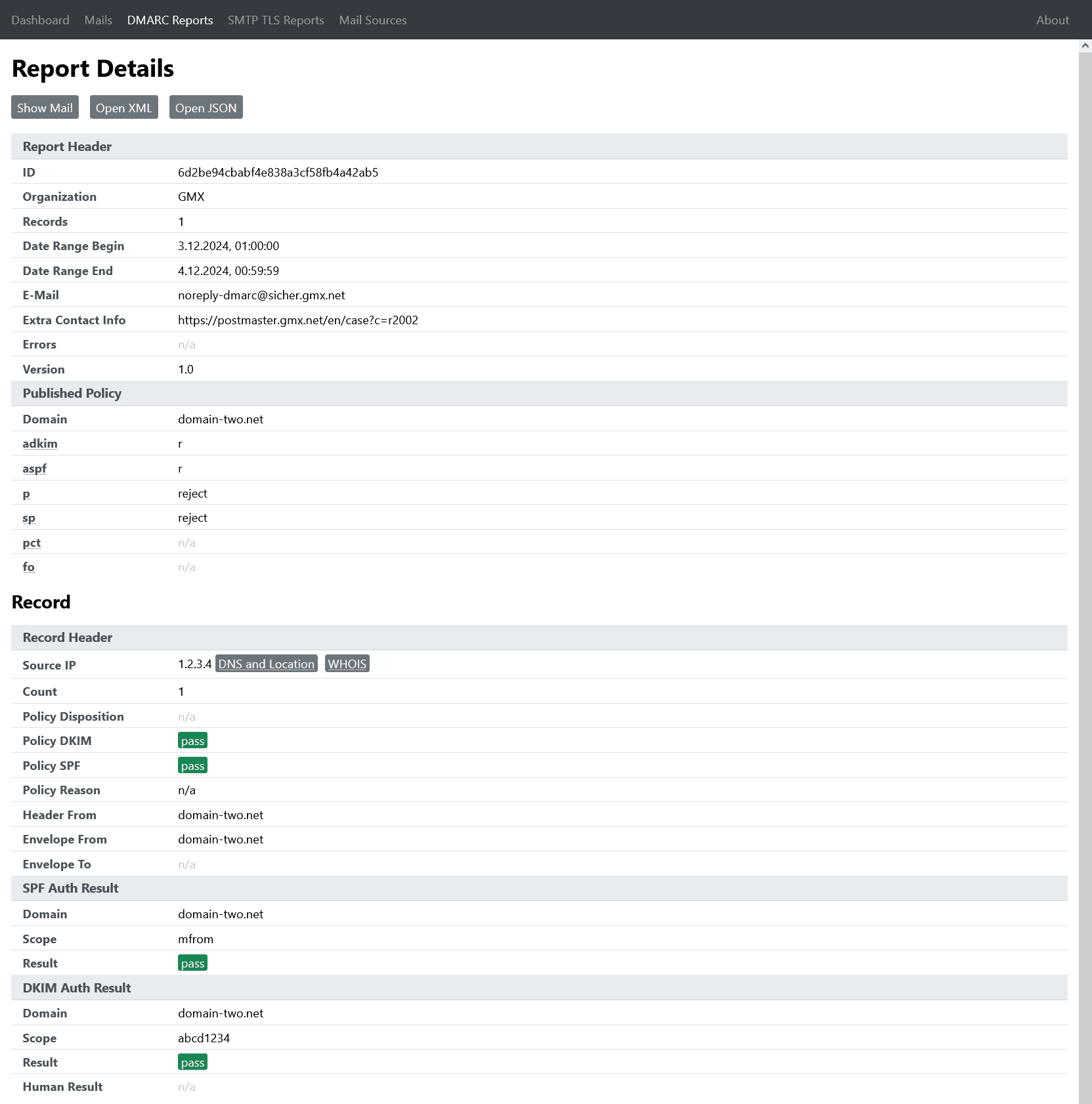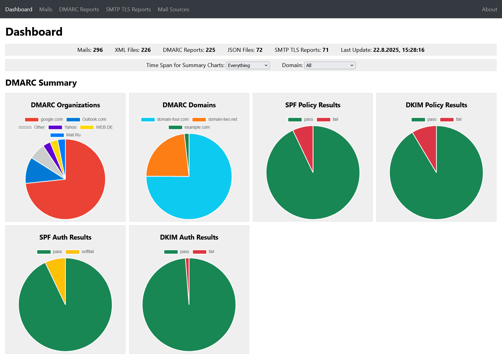 DMARC report viewer is a self-hosted solution designed to parse and visualize DMARC aggregate reports. It provides a foundational set of features for understanding DMARC compliance, identifying email sending sources, and detecting potential spoofing attempts.
